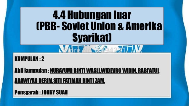 Bincangkan penglibatan amerika syarikat dan soviet union dalam pbb. 20140921 Cadangan pembentukan PBB disahkan oleh Amerika Syarikat Britain dan Rusia di Persidangan Yalta pada bulan Februari 1945. 20170902 Dalam PBB kelemahan yang dipersoalkan ialah pihak atau Negara mana yang akan mengetuai misi ketenteraan PBB dan Negara mana yang akan membiayai segala perbelanjaan sepanjang misi ketenteraan PBB. 20161004 6Huraikan penglibatan Amerika Syarikat dan United Kingdom dalam pertubuhan North Atllantic Treaty Organisation NATO 20 Pengenalan NATO ditubuhkan pada 4 April 1949 beribu pejabat di Paris.