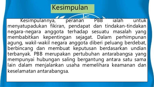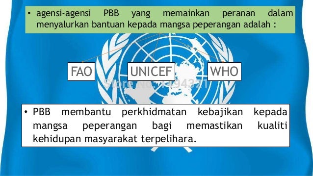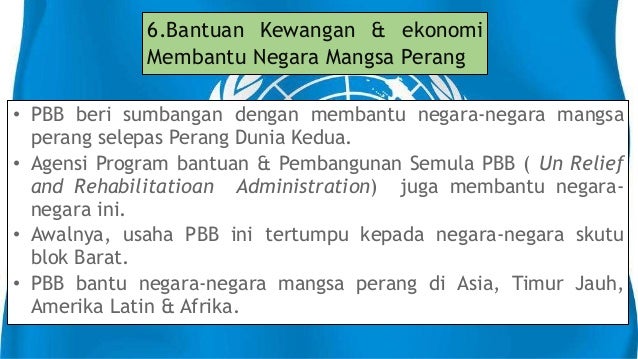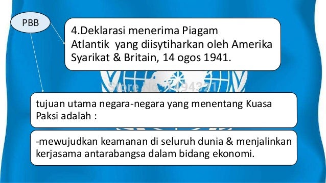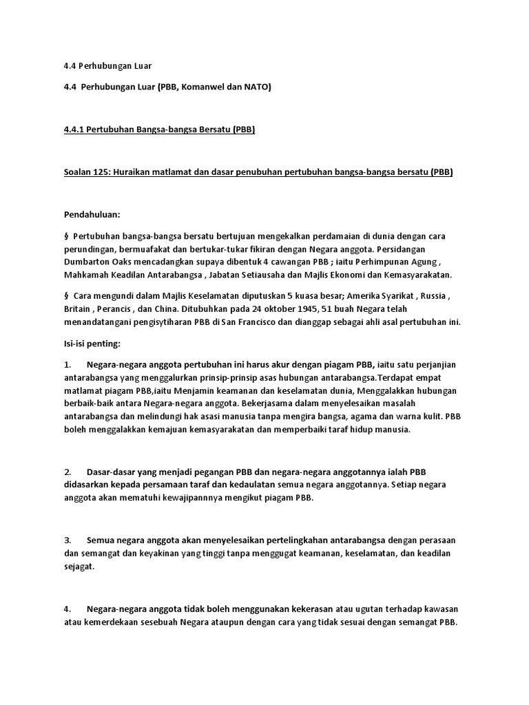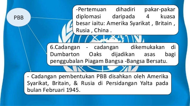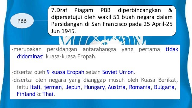 Fokus NATO sering berubah mengikut keadaan memberikan tumpuan kepada soviet. Pertubuhan Bangsa-Bangsa Bersatu disingkatkan kepada PBB ialah sebuah pertubuhan antarabangsa yang ditubuhkan di San Francisco California pada 24 Oktober 1945 selepas Perang Dunia Kedua. Isi-Isi Penting 1 Kemunculan dua kuasa utama dunia yang baru Selepas tamatnya Perang Dunia Keduamuncul dua kuasa besar baharuiaitu Amerika Syarikat dan Soviet UnionKedua-dua kuasa tersebut berada dalam.
