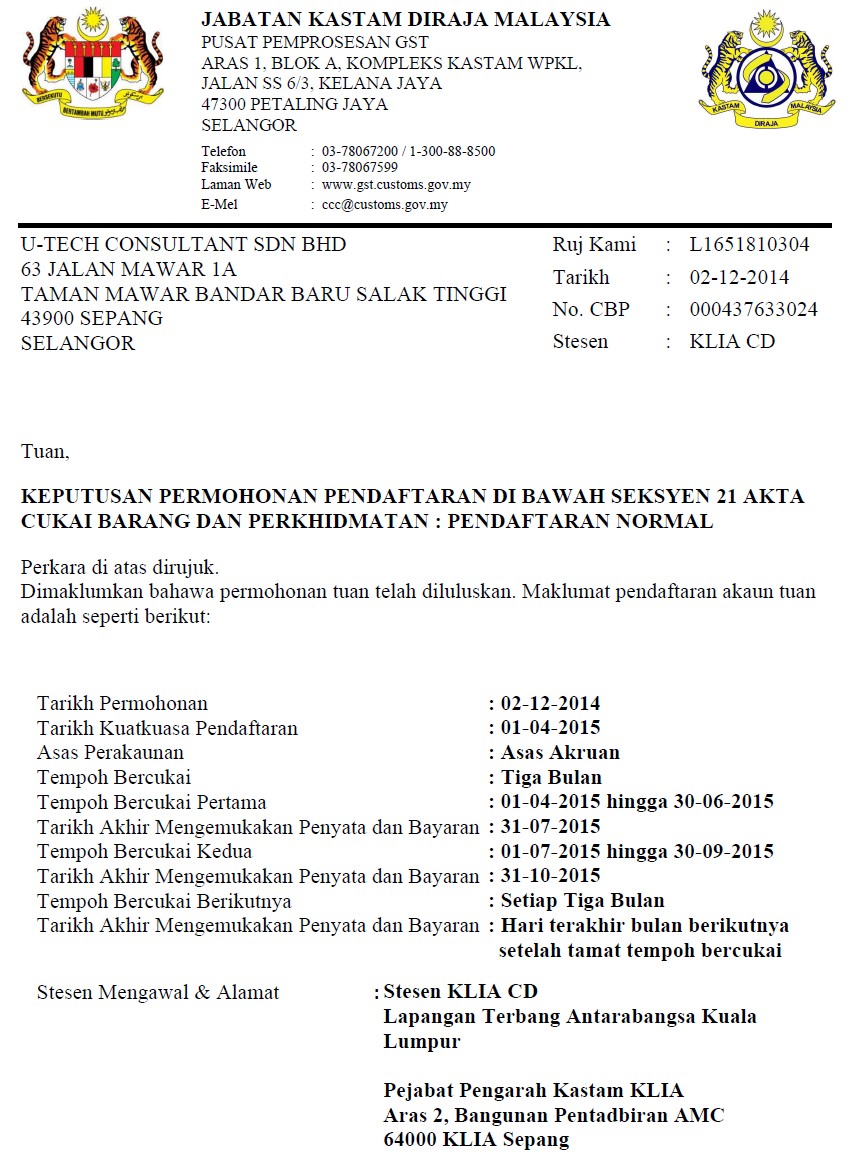 Khidmat konsultasi professional Percuma 6 Bulan Yuran Setiausaha Bernilai RM360 Percuma Cop Getah Syarikat Percuma Khidmat Penghantaran. Surat pengesahan status Constitution. Penyedia Pengilang Perkhidmatan dari kalangan Orang Berdaftar GST yang telah dikenalpasti dan memenuhi kriteria yang diperlukan akan didaftarkan secara automatik sebagai Pengeluar Berdaftar di bawah Cukai Jualan Penyedia Perkhidmatan Berdaftar di bawah Cukai Perkhidmatan.