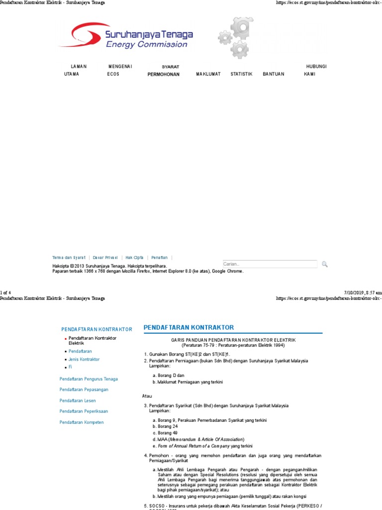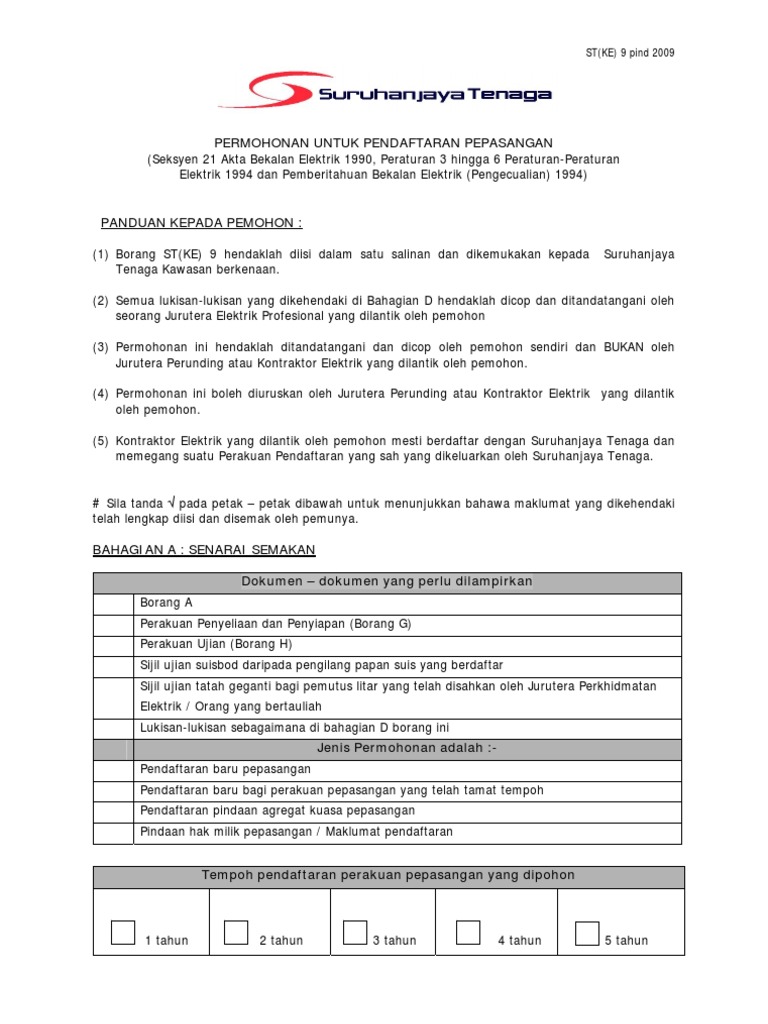 Syarat-Syarat Permohonan Pendaftaran Kontraktor Dan Senarai Semak Permohonan. Setelah pepasangan elektrik itu diluluskan oleh suruhanjaya tenaga untuk didaftarkan memiliki kelayakan dengan suruhanjaya tenaga sebagai jurutera elektrik kompeten sehingga 33kv.